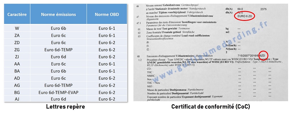 Afin de trouver la norme d'émissions précise à laquelle répond le véhicule, il faut se référer au certificat de conformité (autrement appelé CoC - Certificate of Conformity). Lorsque le véhicule est déjà immatriculé, la norme d’émissions est reportée au niveau du champs V.9 du certificat d’immatriculation.